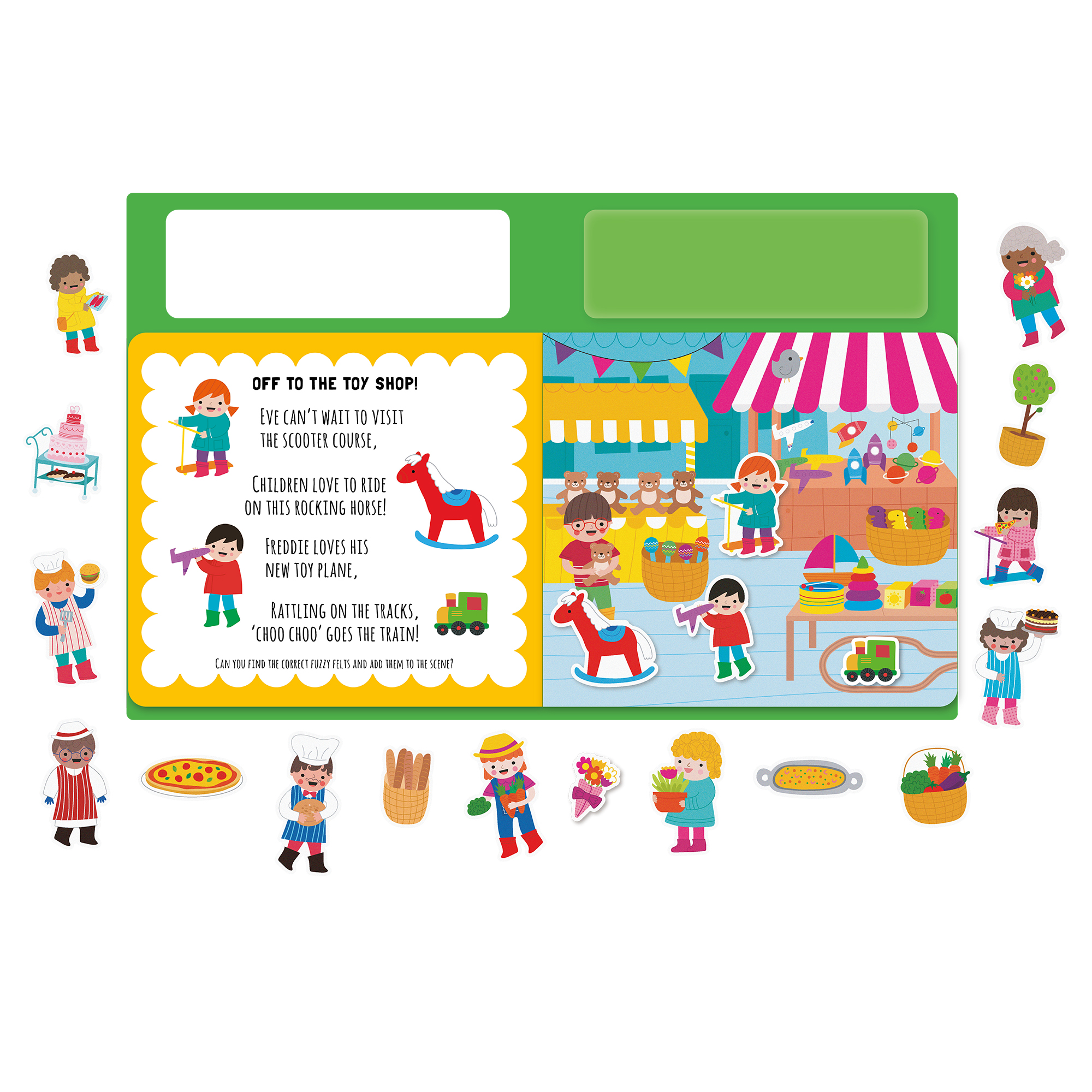 - A cased book with over 20 interactive felt pieces and chunky whiteboard pages throughout.